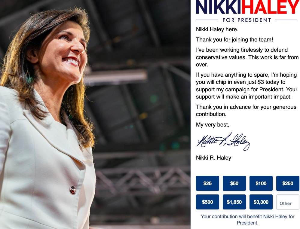 The best were Joe Biden and Nikki Haley by a long way. Both led with donations and images of the candidates as design features, but made it very simple to sign up. Joining an email list felt like a priority and they weren’t simply after your money.