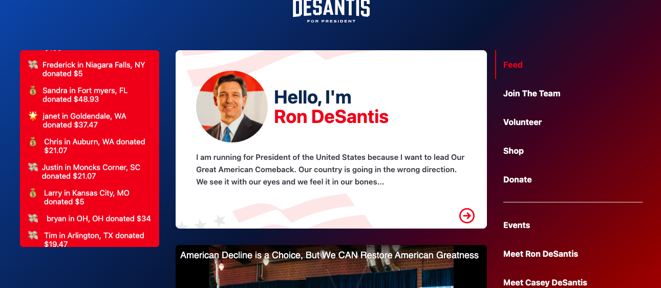 The worst, by an even longer way, was Ron DeSantis. There was no email signup on the landing page and it's laid out like a social media timeline, with a scroll of YouTube videos and merchandise promotions. It was jarring to visit it after all the other candidates' much more traditional pages.