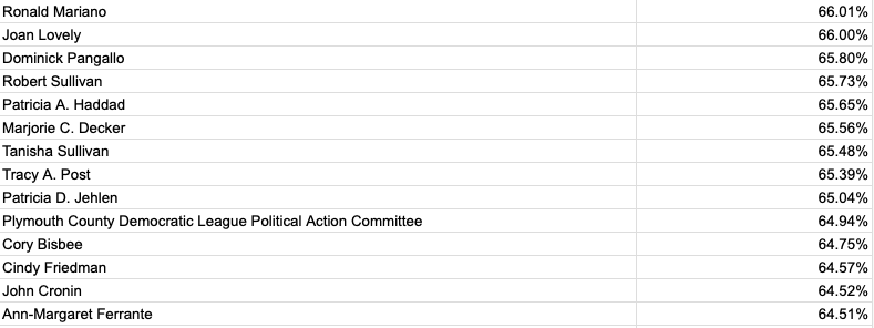 You can see the average donor score for every entity and every office in the OCPF data from 2021 to 2023 (free with email signup).