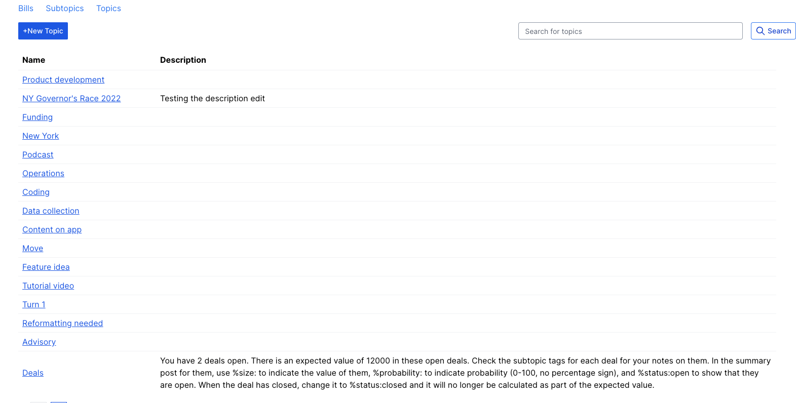 As the deal progresses, you may want to add more notes for this. It’s as simple as creating a new note and tagging it with the correct deal as a subtopic tag. You’ll automatically get a feed of those notes when you go into that deal tag.