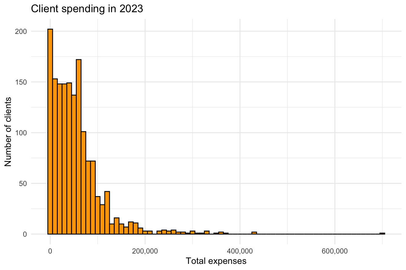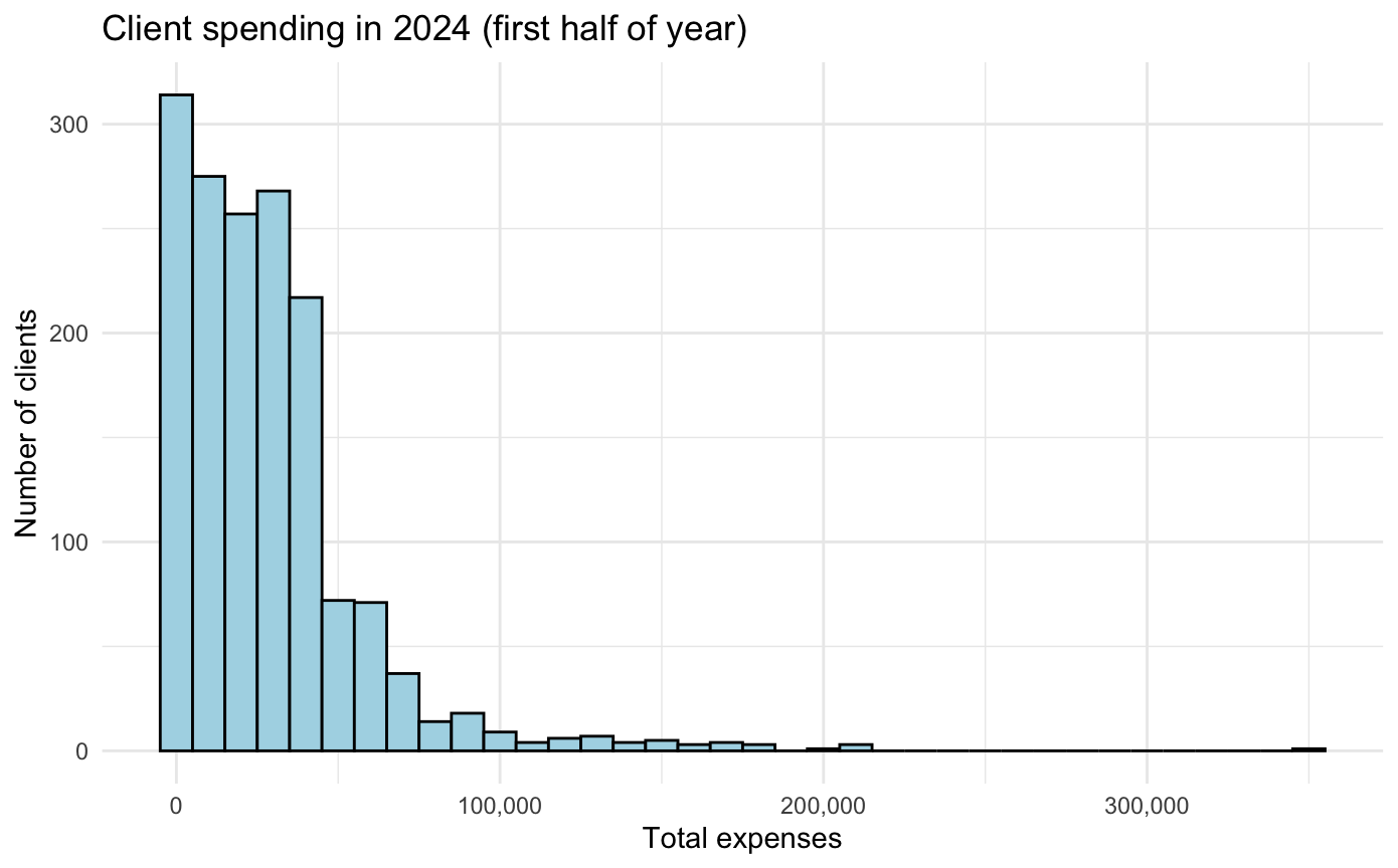 As with lobbyist earnings, there is a power law in effect, with the median client spending $45,000. Yet that still leaves nearly as many clients spending more on lobbying than the average representatives earns as there are members of the legislature.