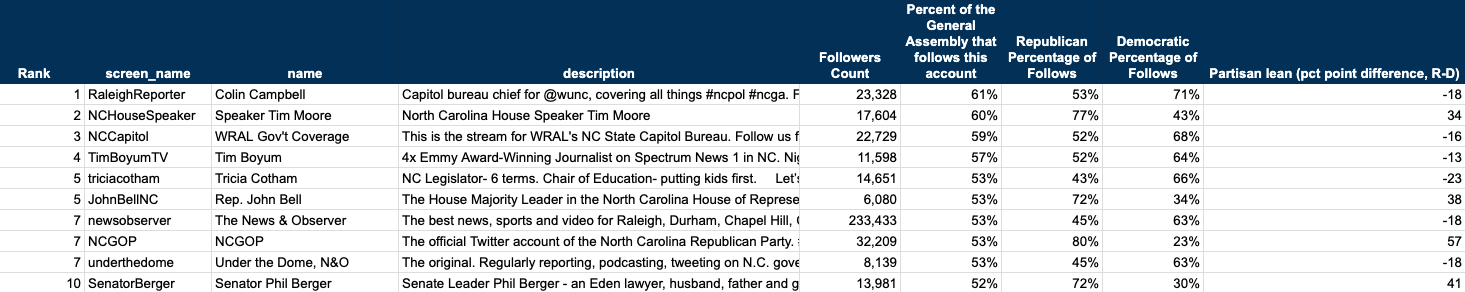 We recently looked at who North Carolina state legislators follow on Twitter to get a sense of whose voices the Tar Heel State’s elected officials are most likely to see when they open the app. In this post, we’re going to take a deeper look at the party splits within the data to see trends among both Democrat and Republican members of the assembly.