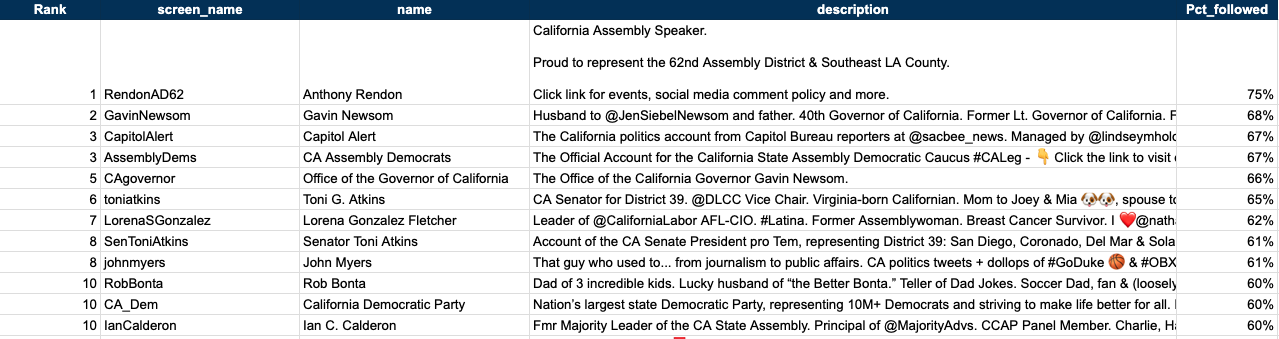 Most followed accounts by California state legislators. One note is that the data was collected while Anthony Rendon was still speaker.